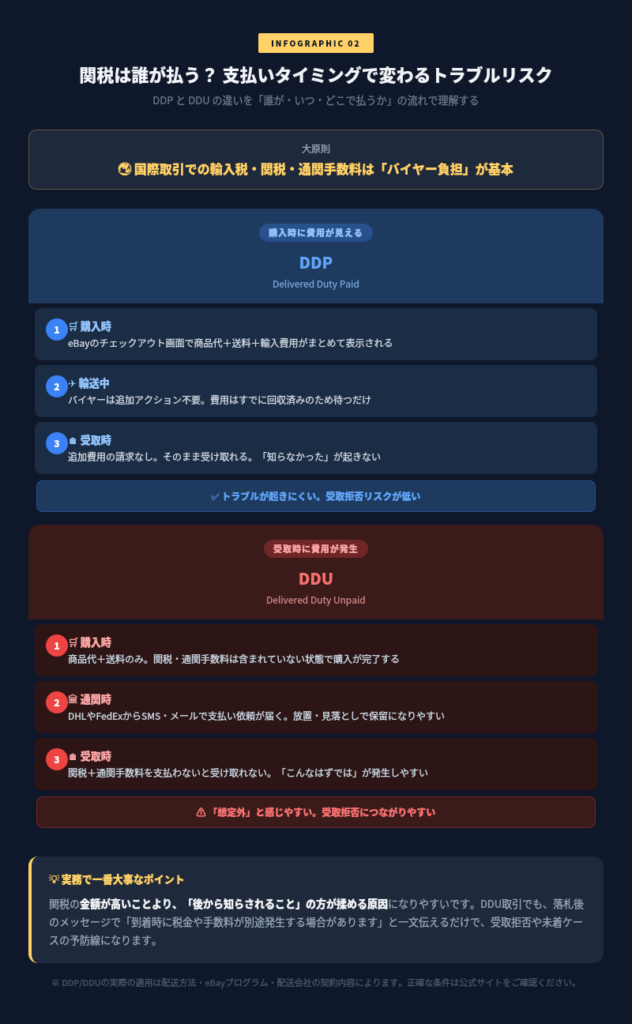 関税の支払いタイミングを整理したいなら、ebayで関税をいつ払うかの解説も合わせて読むと流れがつかみやすいです。