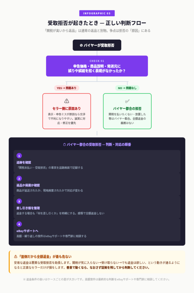 関税の存在が気に入らないから受け取らない、でも返金は欲しいという動きが通るようになると、普通に運営しているセラーだけが損をします。