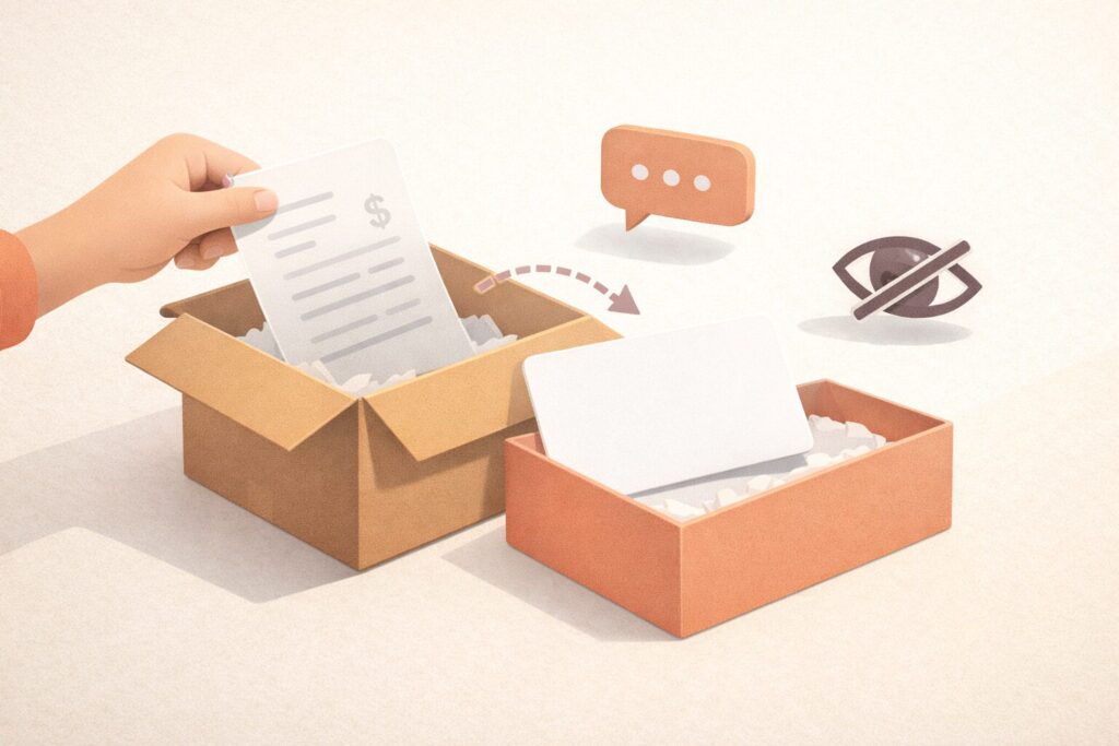 ただし、海外発送が絡むと「通関用に外側へ書類を貼る」「商業インボイスが必要」などの都合が出てきて、完全に情報をゼロにするのが難しいケースもあります。