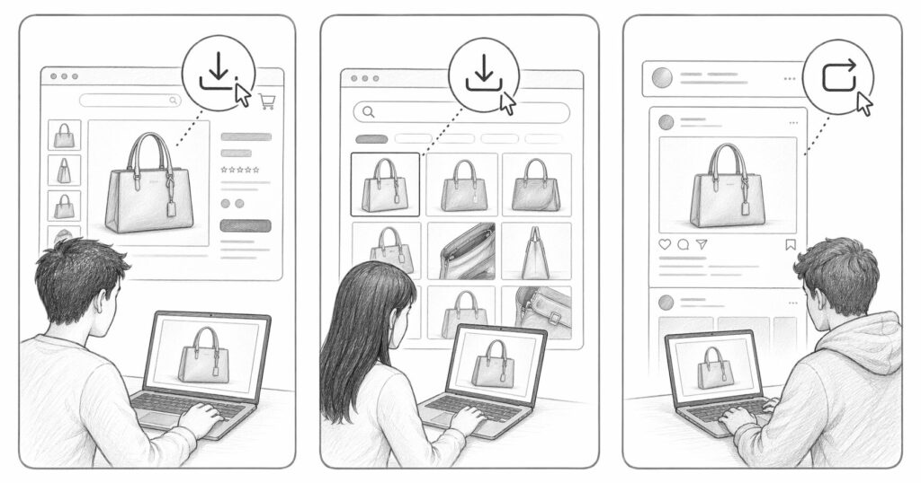 メルカリやヤフオク、ラクマといった国内プラットフォームで出品中の画像を保存し、ebayで無在庫販売するために転用するケースが目立ちます。