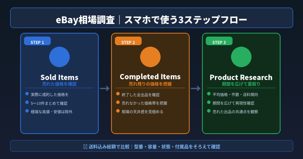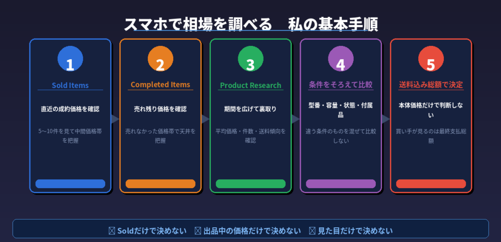 スマホ完結を目指すなら、Soldで瞬間の相場、Completedで売れ残り、Terapeakで期間の流れ。