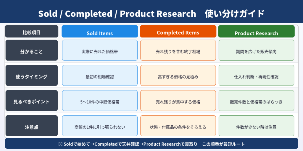私なら、まずSold Itemsでざっくり相場をつかみ、Completed Itemsで売れ残りを見て、必要なものだけProduct Researchで深掘りします。