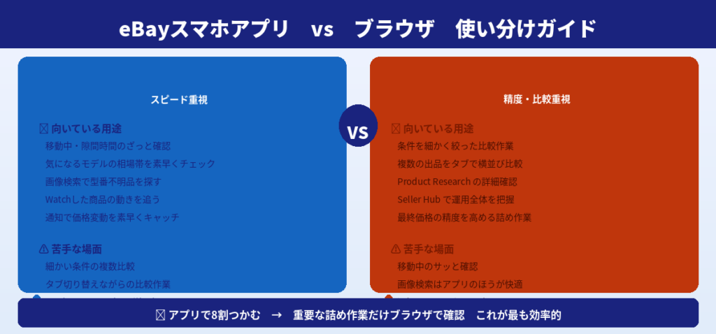 eBayの相場をスマホで調べたいけれど、Sold ItemsとCompleted Itemsの違いが分からない、TerapeakやProduct Researchはどこにあるのか迷う、Seller Hubとアプリの使い分けも曖昧、そんな状態だと価格判断がぶれやすいですよね。