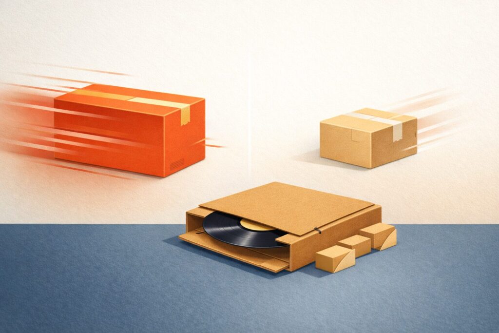 レコードは「薄いけど重い」「角が弱い」「暑さと衝撃に弱い」というクセがあるので、同じ重量の服や雑貨よりも梱包材が増えがちで、結果として送料が高く見えることが多いです。