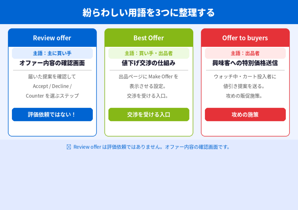 Review offersは「受けた交渉を処理する画面」、Offer to buyersは「こちらから提案する機能」と覚えると、出品者側の頭の中がかなりスッキリします。