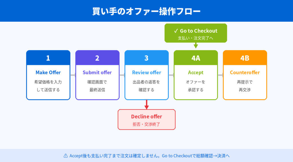 実際、eBay公式でも、出品者から特別オファーを受け取った場合はReview offerから内容確認を行い、その後にGo to checkoutやDecline offer、Make a counterofferへ進む流れが案内されています。