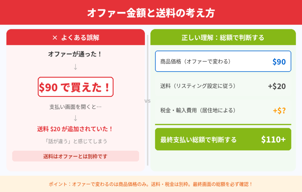 - オファーは商品価格への提案で、送料は別計算になりやすい