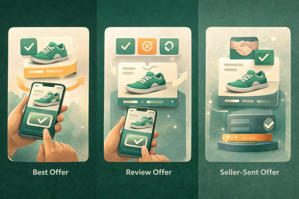 Seller Hubやリスティング管理の流れの中で、受け取ったオファーを一覧で確認したり、どの買い手にどの条件を返すか判断したりする場面で使われやすい表現です。